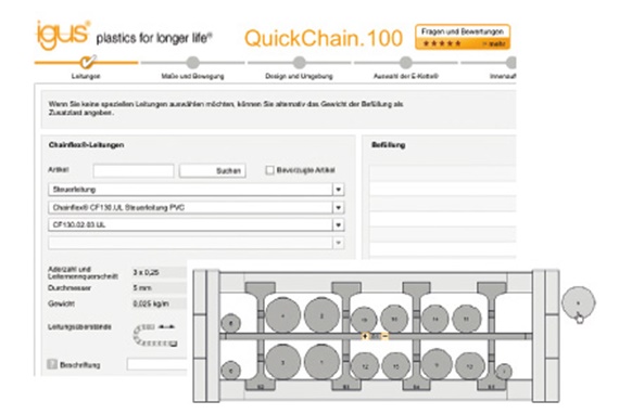 igus®, plastikten üretilen ilk hareketli kablo kanalını 43 yıl önce sundu; bugün şirket tüm dünyada en geniş esnek kablo portföyü ile en geniş plastik kablo kanalı ürün gamını sunuyor. Büyük portföyde gezinmek için müşteriler kablolar ve konektörlerle kablo kanallarını kolayca seçmek ve hatta servis ömrünü hesaplamak için bir online araç kullanabilir. Bugün igus® enerji beslemesinde bir sistem tedarikçisidir. readychain® sistemleri bitmiş ve özel montajlı üniteler olarak sunulmaktadır.