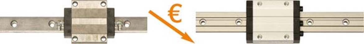 Identical connection dimensions for boreholes and connecting parts like many recirculating ball bearing guides