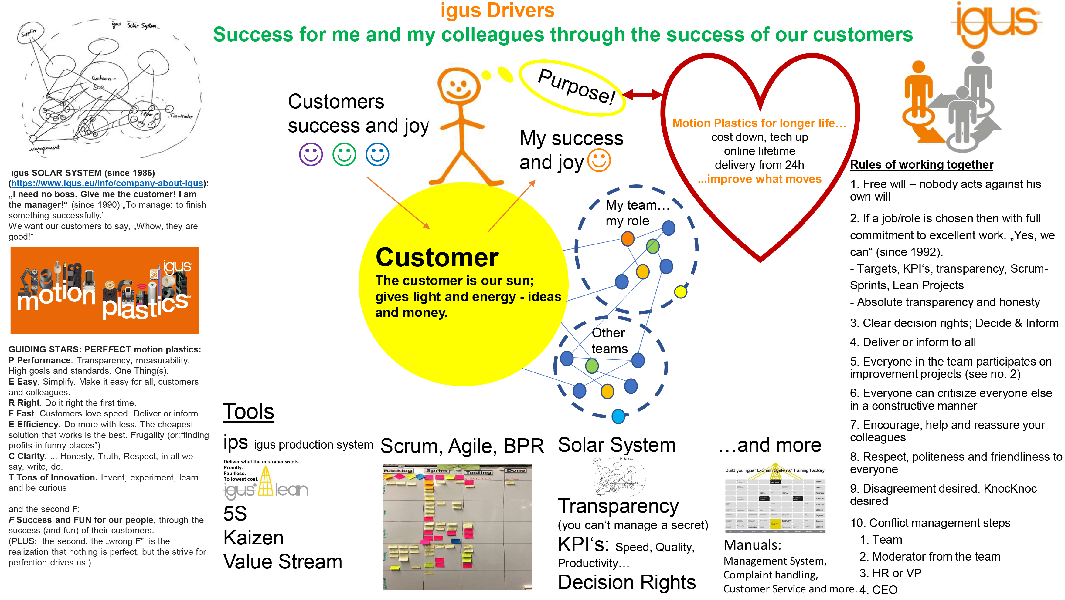 igus'ta müşteri, tüm faaliyetlerin merkezinde yer almaktadır. Güneş dünya üzerindeki hayat için ne kadar önemliyse, bizim için müşteri de o kadar önemlidir: ışığın, ısının ve enerjinin kaynağıdır. Müşteri bize fikirler ve iş verir ve büyümemizi ve ilerlememizi sağlar. "igus güneş sistemi", şirket felsefemize sıkıca kök salmıştır. Çalışanlar ve ekipler tıpkı gezegenler gibi müşterilerimizin yörüngesinde hareket eder, isteklerini not alır ve sorunlarına çözüm bulur. Müşterinin memnuniyeti, bizim memnuniyetimiz demektir.